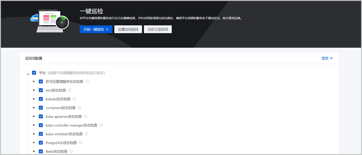 | 开始一键巡检 | 自定义选择巡检项后,对所选巡检项进行一键巡检。 |