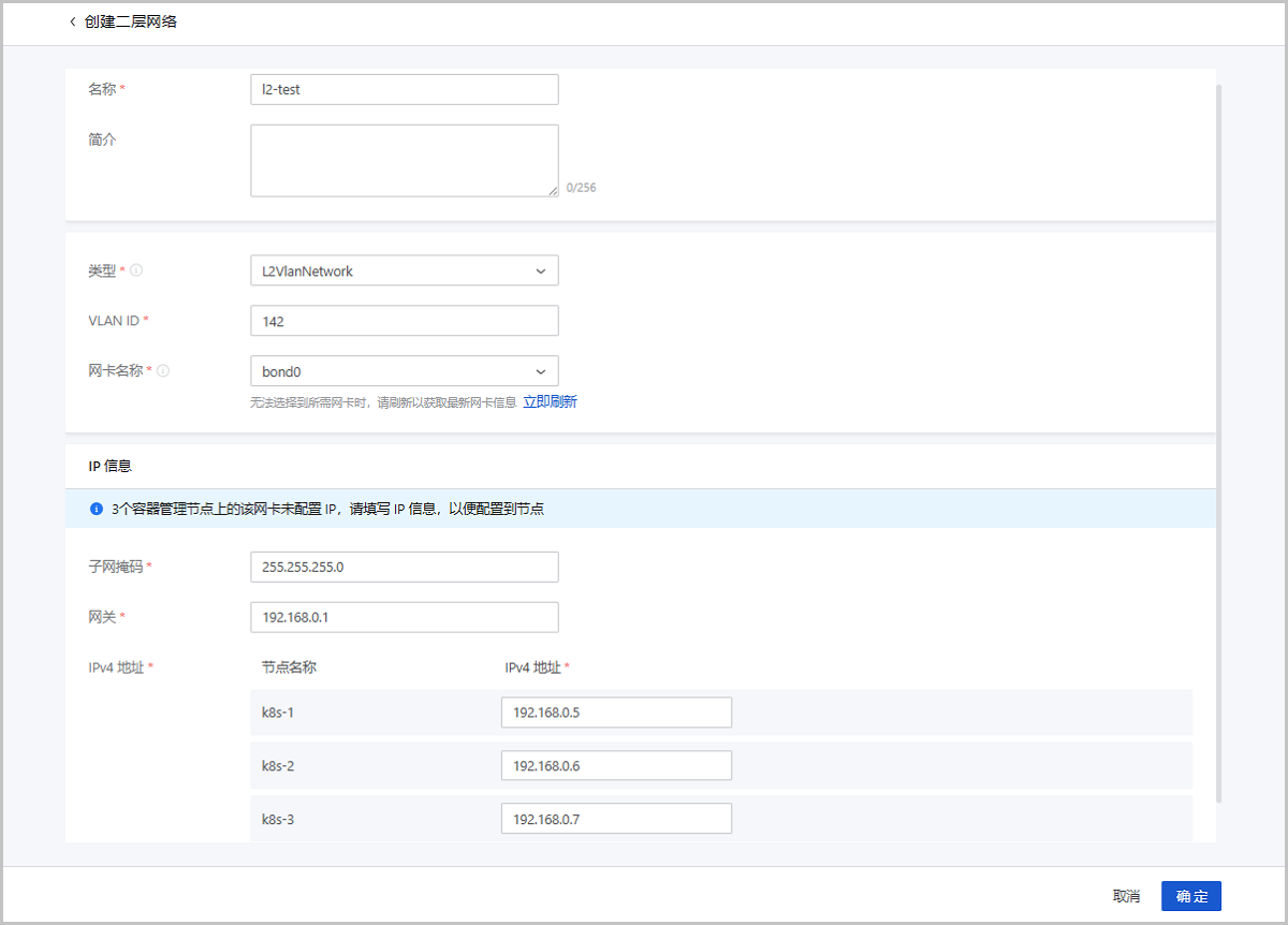 在ZStack Cube 双引擎版主菜单,点击,进入二层网络界面。点击创建二层网络,弹出创建二层网络界面。