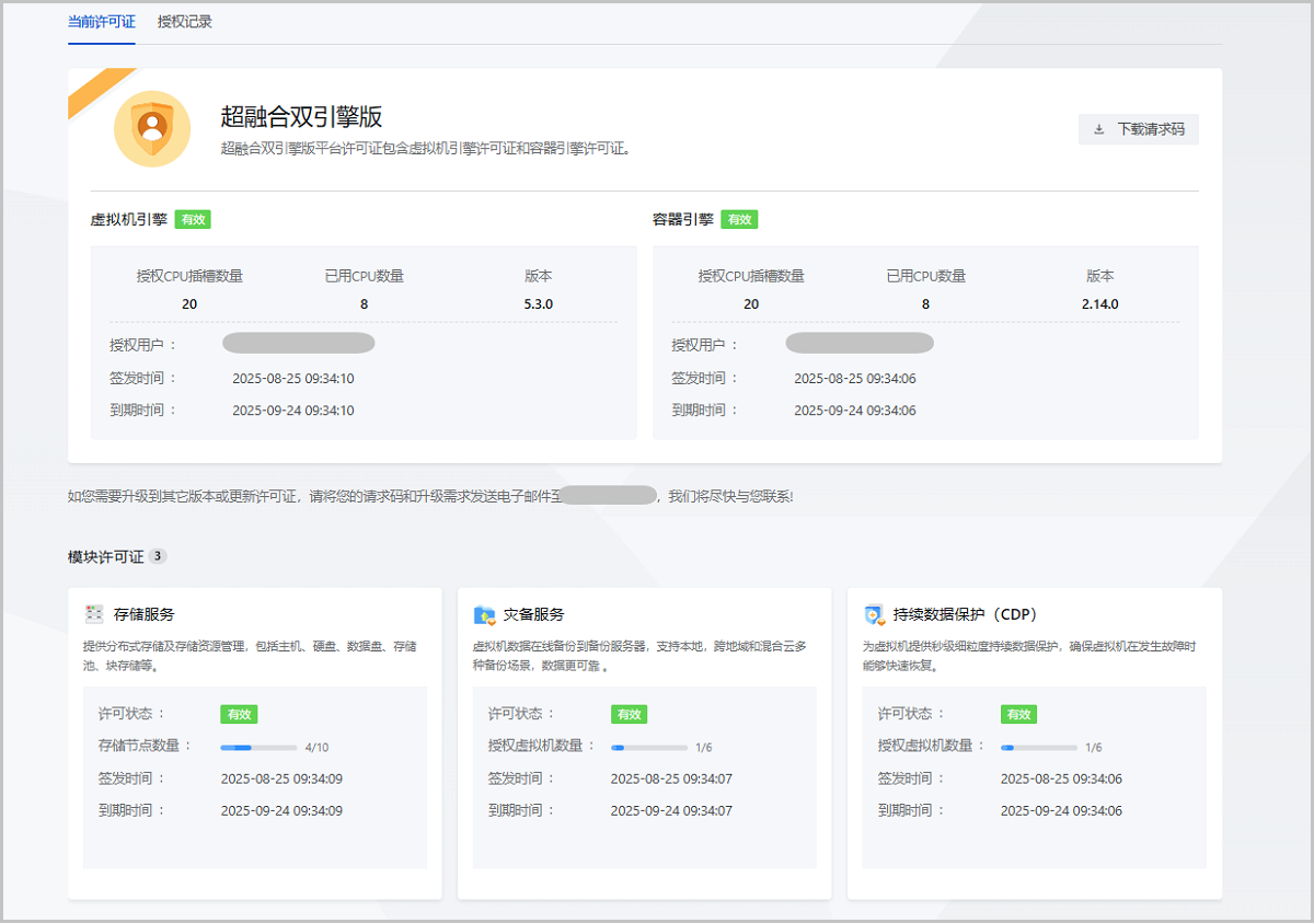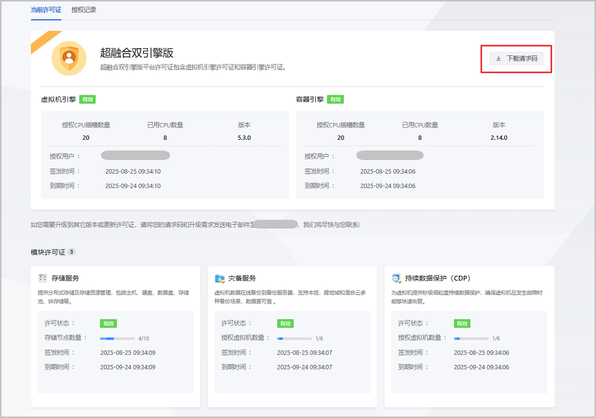 在ZStack Cube 双引擎版主菜单,点击,进入许可证管理界面。在许可证管理界面,点击请求码后的下载按钮,将请求码下载到本地。