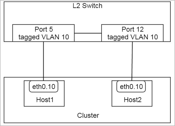 在上图这个配置中,交换机的两个端口5和12是带VLAN 10标签(tagged VLAN 10)的端口, 这样管理员就可以使用physicalInterface = eth0和vlan = 10创建L2VlanNetwork,并将它挂载到集群上。