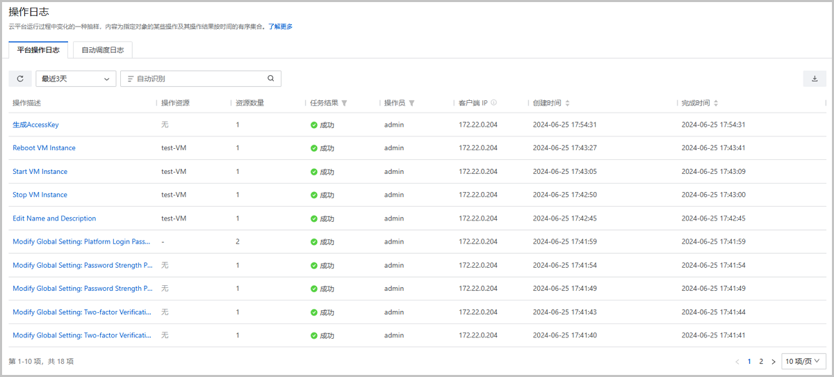 操作日志包括平台操作日志和自动调度日志两个子页面。可通过快速查看云平台操作日志,结合云平台审计功能进行细粒度操作追踪与问题排查,进一步提高运维效率。