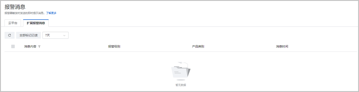 报警消息包括云平台和扩展报警消息两个子页面。通过报警消息,可在云平台页面快速查看报警统计图表和报警消息条目。