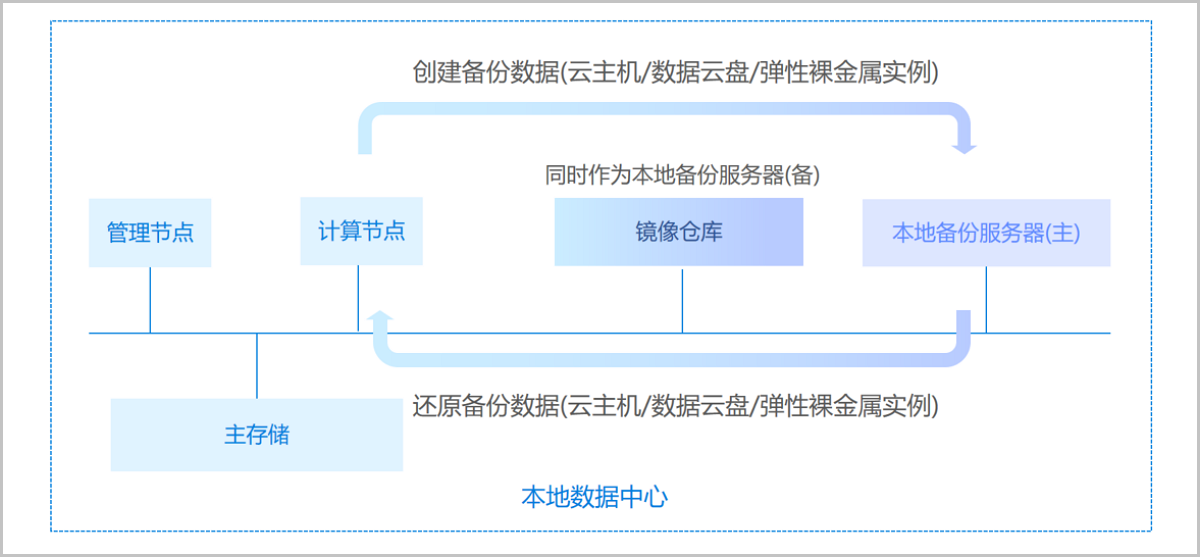 支持将本地部署的镜像仓库作为本地备份服务器,用于存放本地云主机/数据云盘/弹性裸金属实例/管理节点数据库(简称数据库)的定时备份数据。同时本地备份服务器支持主备无缝切换,有效保障业务连续性。