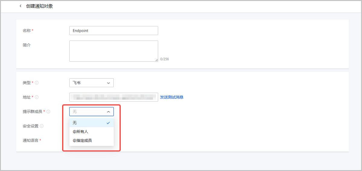 企业微信/飞书通知对象发送消息时可@相关人员,使其快速注意并响应报警,提高运维效率。用户可按需选择是否开启通知对象的@群成员功能,并灵活调整被@成员名单。