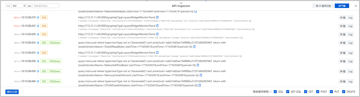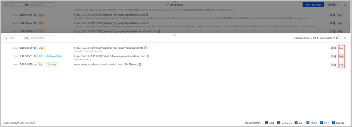 ZStack Cloud 4.8.10版本中,API Inspector增加UI GQL请求信息,并将UI请求和后端请求关联,用户可按UI请求分组,查看一个UI请求及与其关联的一组后端请求,获取更清晰、易读的信息视图。