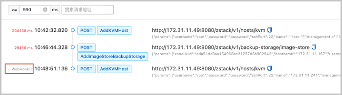 ZStack Cloud 4.8.10版本中,对于异步请求,用户可在API Inspector中直接获取由Webhook推送的真实Response,更直观、准确地掌握异步请求的任务执行结果。如异步请求前的耗时时间栏显示Webhook,则表示该请求正在等待Webhook结果推送。