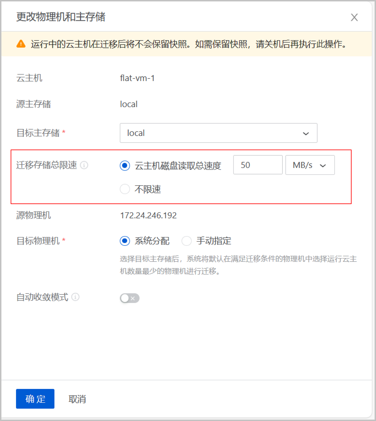 ZStack Cloud 4.8.10版本中,云主机执行更改主存储、更改物理机和主存储操作时,支持设置迁移存储总限速,通过限制云主机整机在源主存储的I/O读速率上限,实现存储迁移限速。通过限速,用户可主动管理和控制迁移过程,减少因大规模数据迁移导致的I/O争抢,降低对业务的影响。