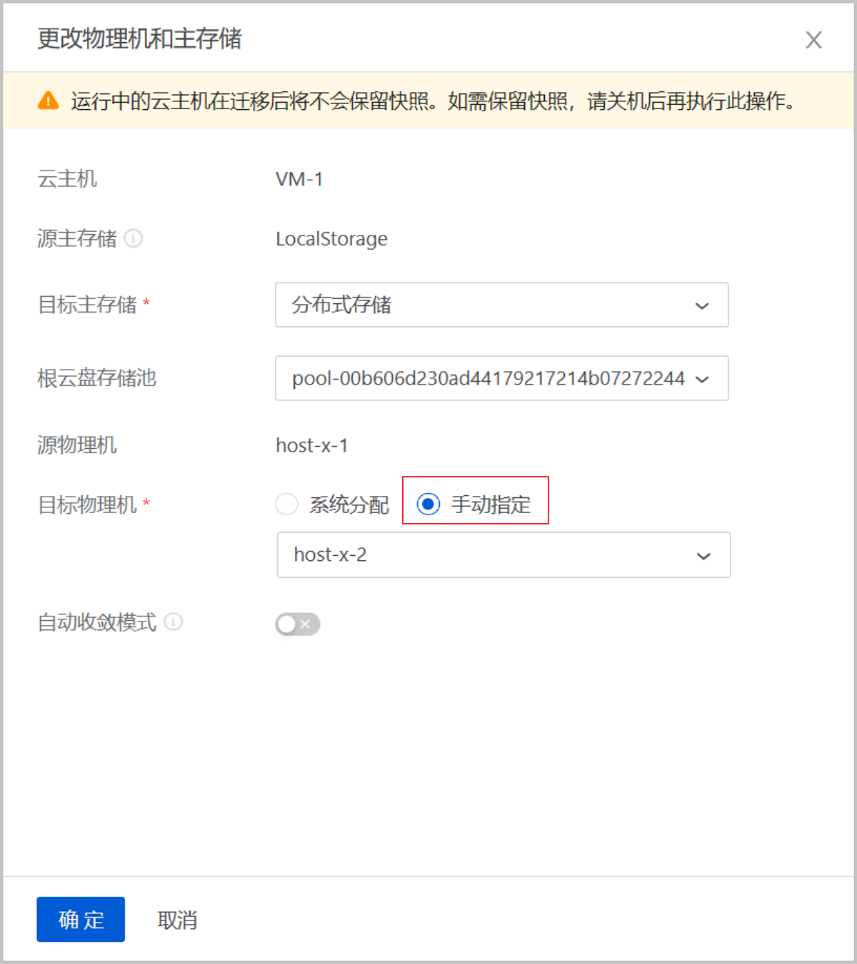 在之前版本中,云主机更改物理机和主存储仅支持系统分配物理机。ZStack Cloud 4.7.21开始,云主机在线更改物理机和主存储时,支持手动指定目标物理机,系统将自动根据所选目标主存储过滤出可选物理机。