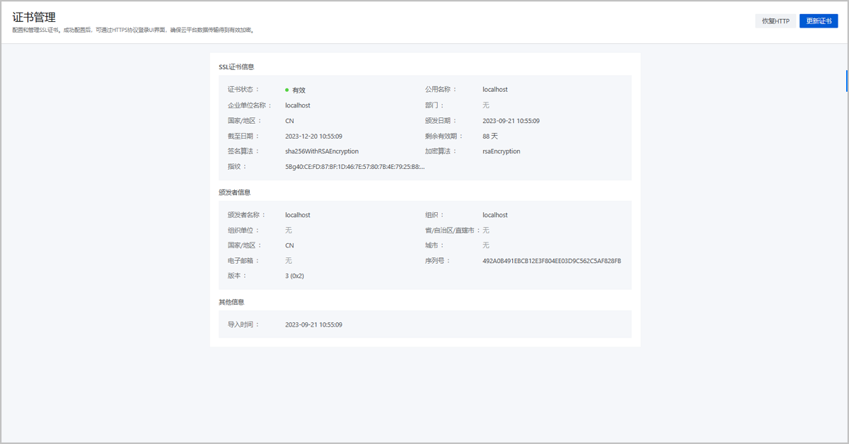 ZStack Cloud 4.7.21开始,支持在UI界面生成系统自签证书或导入第三方SSL证书。成功配置证书后,用户可通过HTTPS协议登录UI界面,从而确保云平台数据传输得到有效加密。
