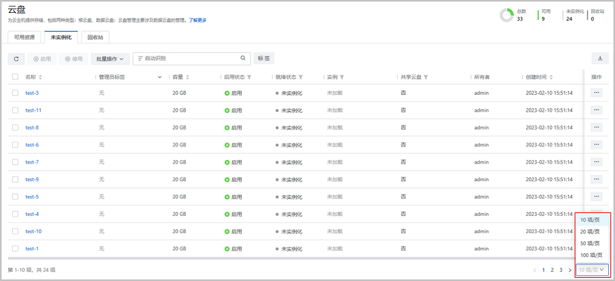 在之前的版本中,云平台已支持资源主列表分页展示,用户可自定义设置单个页面展示的资源条目数。设置的单页条目数仅支持一次性使用,刷新或重新进入资源主列表后,单页条目数将恢复系统默认值。