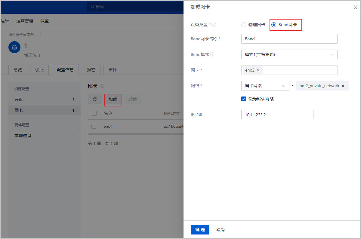用户可在UI界面为弹性裸金属实例业务网卡配置Bond,支持AB和LACP两种模式。Bond类型网卡可显著增强业务网络可靠性,提升网络性能。