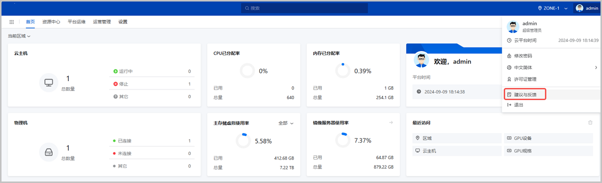 ZStack Cloud 5.2.0开始,个人中心新增建议与反馈按钮,点击按钮,可跳转产品调查问卷,便捷提交您的使用感受、问题和建议,帮助ZStack Cloud提升服务响应速度和产品改进效率。