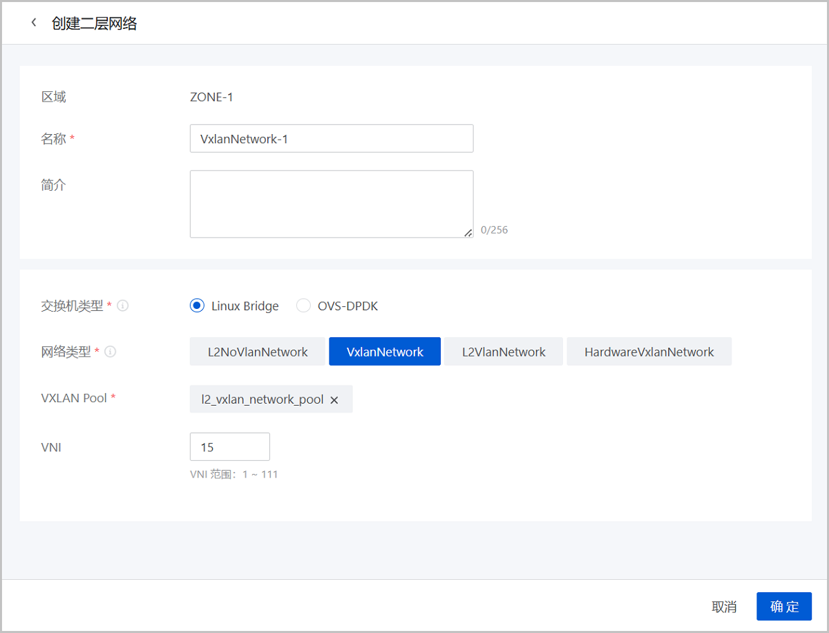 ethx格式的网卡名称会在系统重启后导致网卡顺序随机改变,尤其是带多网卡的云主机环境中,建议将各计算节点的网卡设备名称修改成非ethx格式,例如:可修改成em01格式。在ZStack Cloud主菜单,点击,进入二层网络界面。点击创建二层网络,弹出创建二层网络界面。