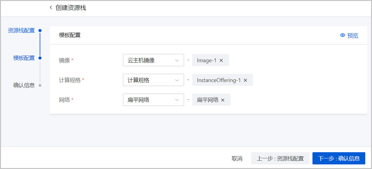 • 开始创建资源栈前,可点击预览查看将要创建的资源列表。
