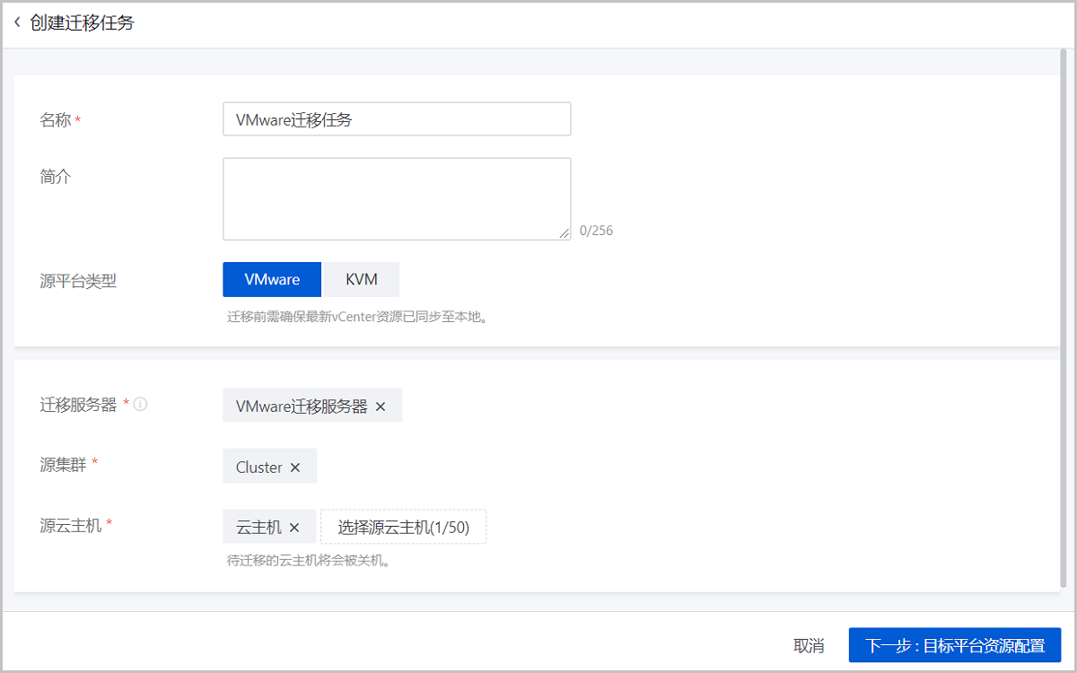 | 迁移中 | vCenter云主机正在迁移至当前云平台,该过程分为以下三个阶段: