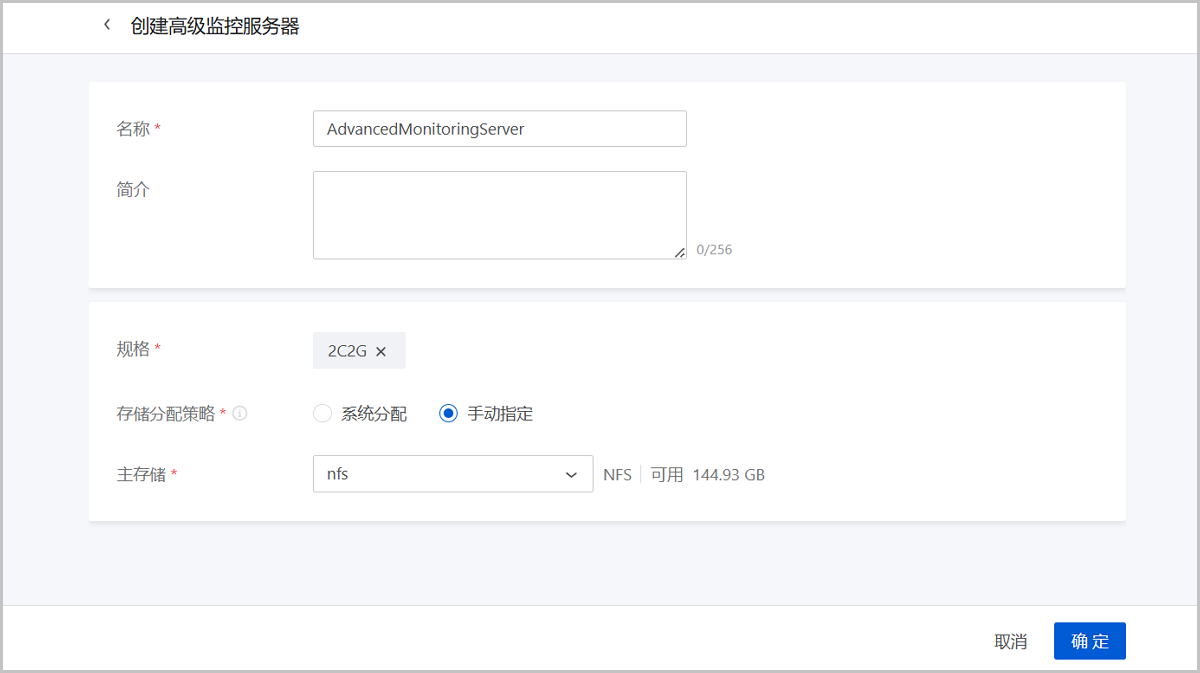 在ZStack Cloud主菜单,点击,进入高级监控服务器界面,点击创建高级监控服务器,弹出创建高级监控服务器界面。