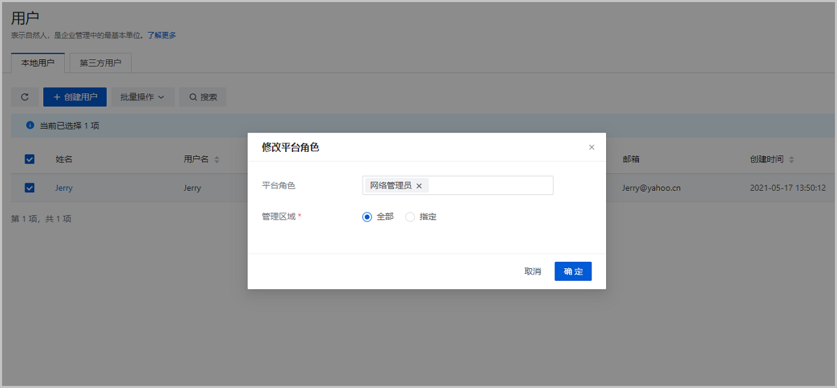用户界面选中已创建的用户Jerry,点击操作 > 修改平台角色按钮,在弹出的修改平台角色弹窗中选择网络管理员,点击确定按钮,将网络管理员角色绑定到用户(Jerry)。