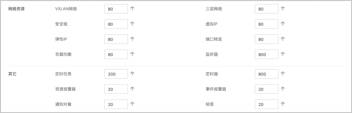 • 网络资源:包括VXLAN网络数量、三层网络数量、安全组数量、虚拟IP数量、弹性IP数量、端口转发数量、负载均衡器数量、监听器数量的配额设置