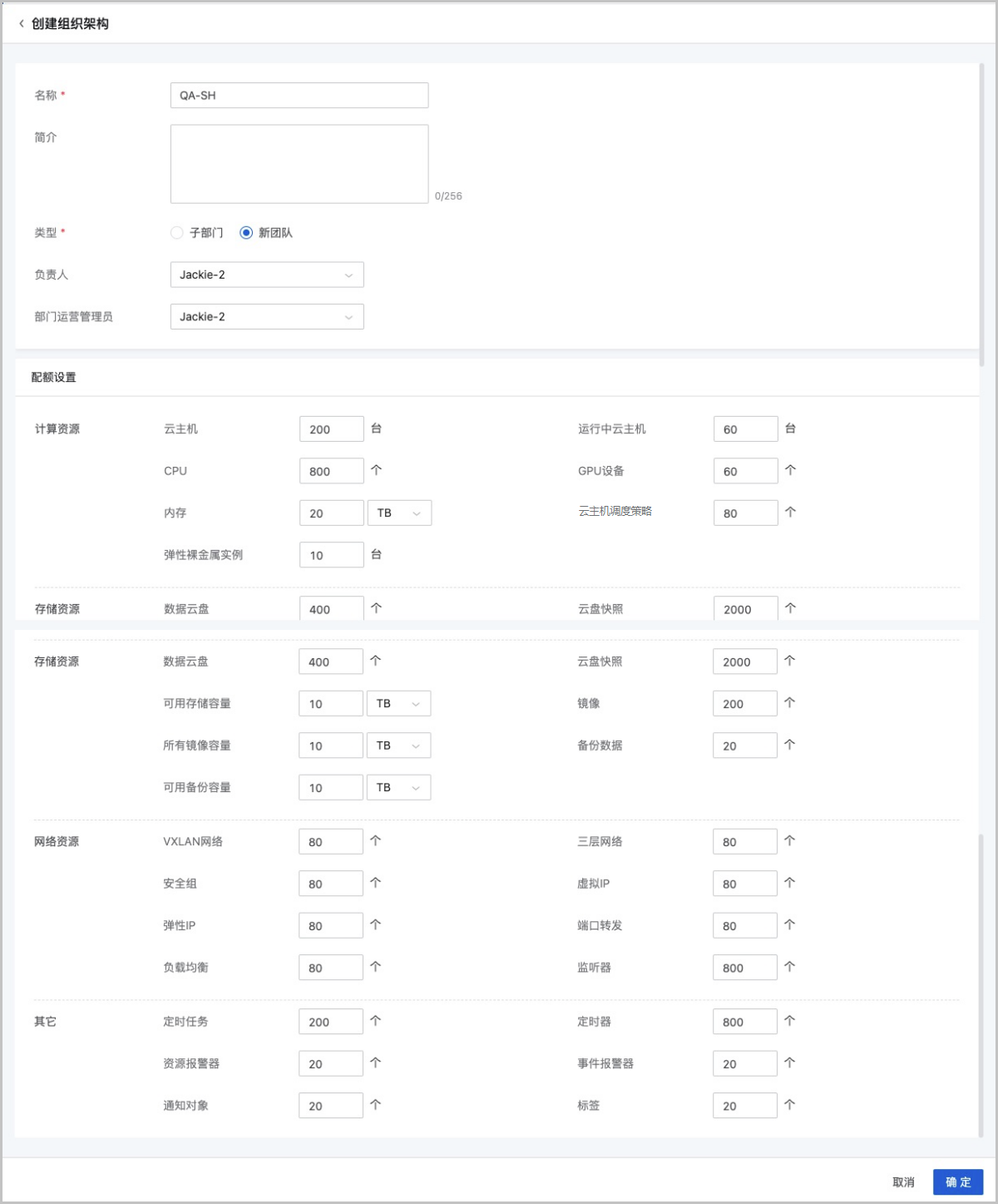 • 配额设置:支持为组织手动设置配额,可设置的资源如下: