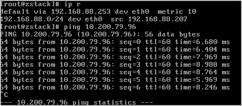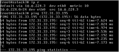 ping通。 至此,ZStack Cloud私有云云主机和阿里云ECS云主机即可使用阿里云高速通道的方式实现互通。