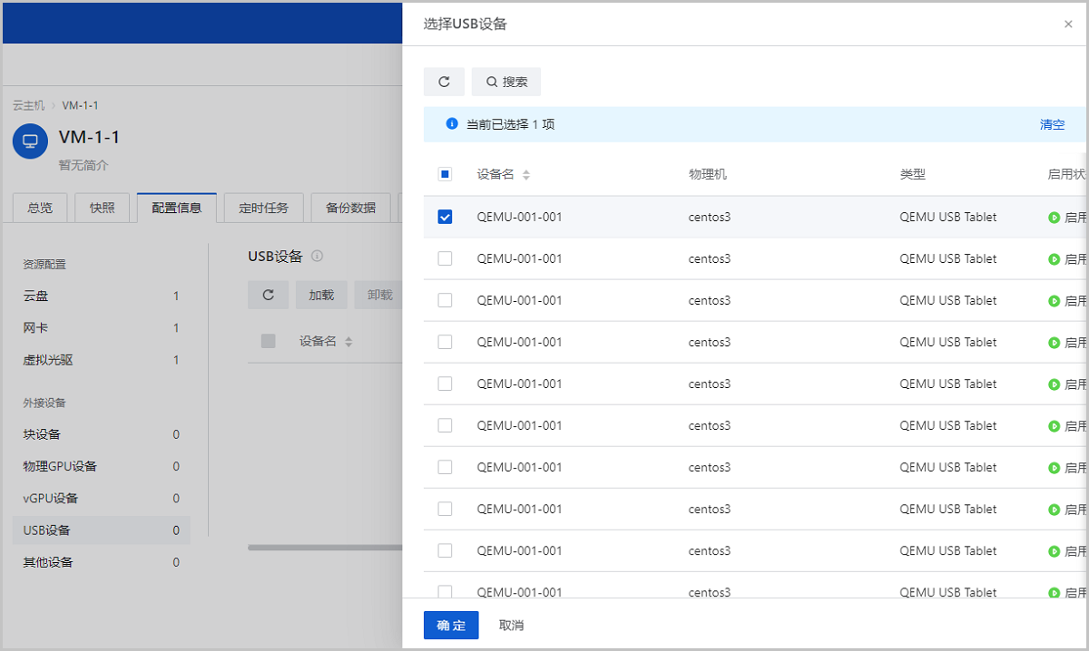 系统会根据所选的加载方式筛选选择USB设备列表,此时,选择一个需要加载到云主机的USB设备,点击确定按钮,完成加载。如图 2所示: