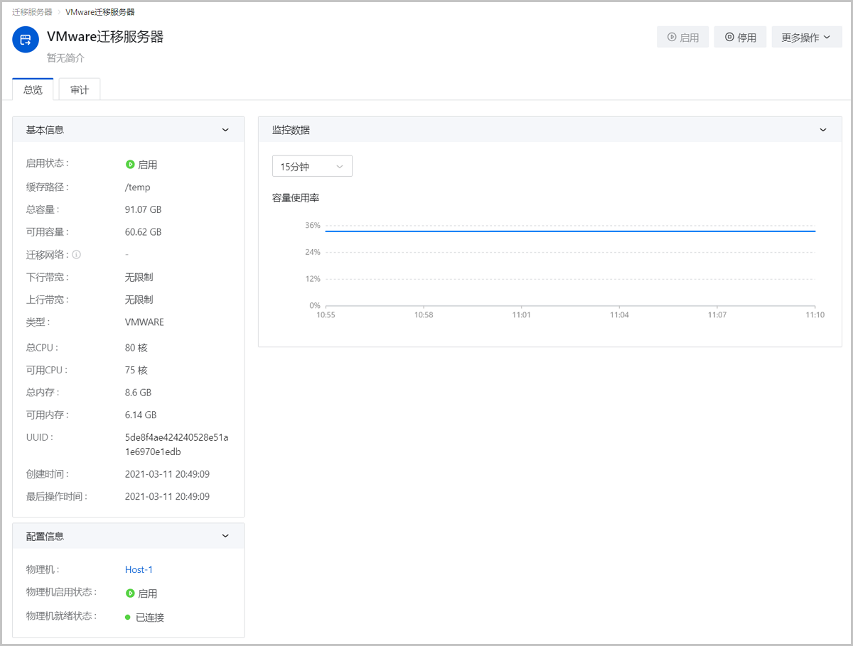ZStack Cloud主菜单,点击平台运维 > 迁移服务 > 迁移服务器,点击所添加的迁移服务器即可进入迁移服务器详情页,该页面展示了基本信息、监控数据以及配置信息。