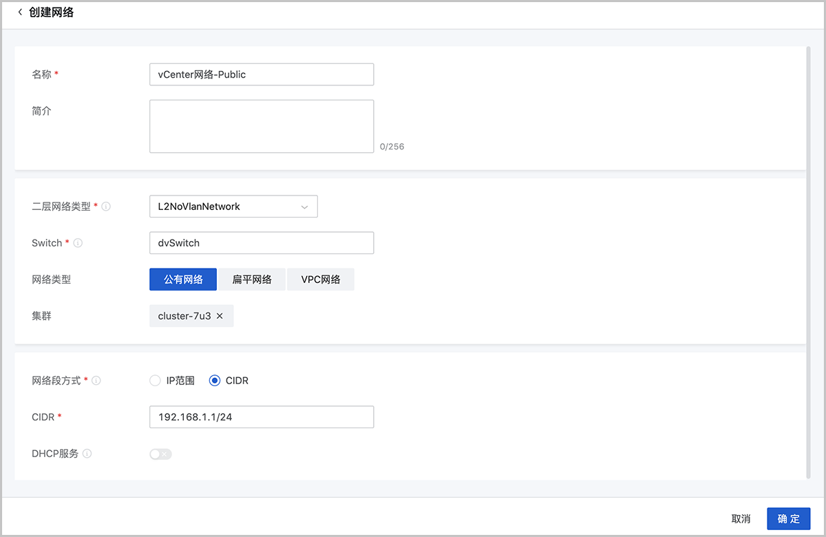 | 创建vCenter网络 | 创建一个vCenter网络,网络类型包括:公有网络、扁平网络、VPC网络。 |