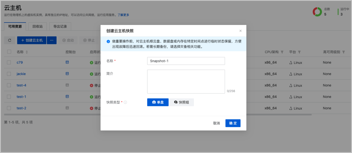 在ZStack Cloud主菜单,点击,进入云主机界面。选择某一云主机(运行中/已暂停/已停止),点击,弹出创建云主机快照界面。