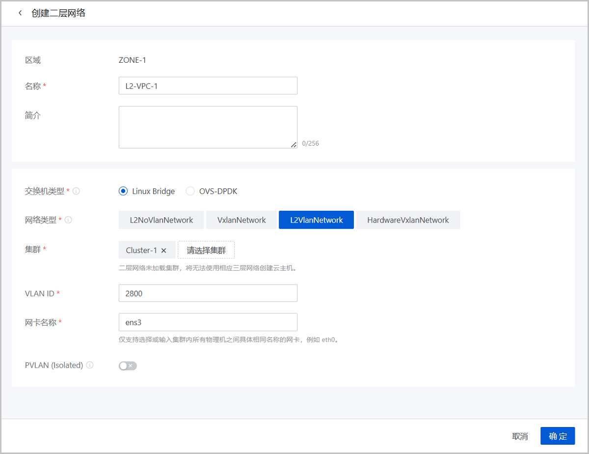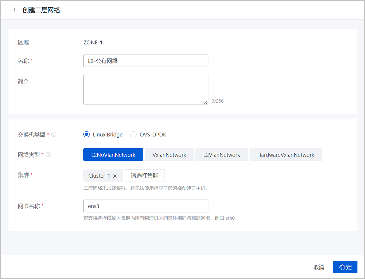 请参考公有网络配置信息创建三层公有网络。