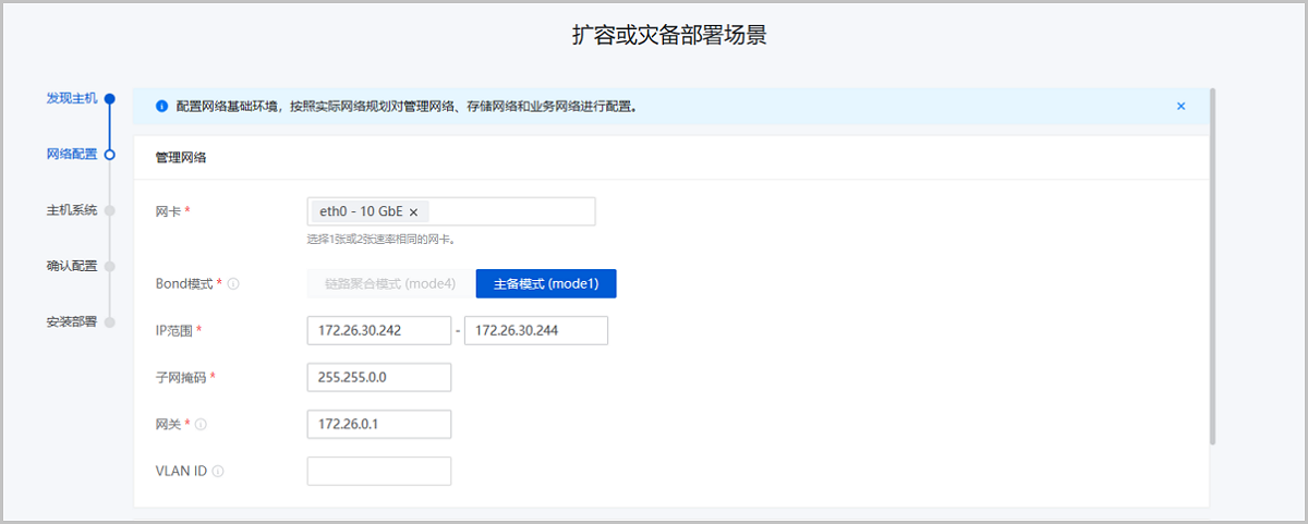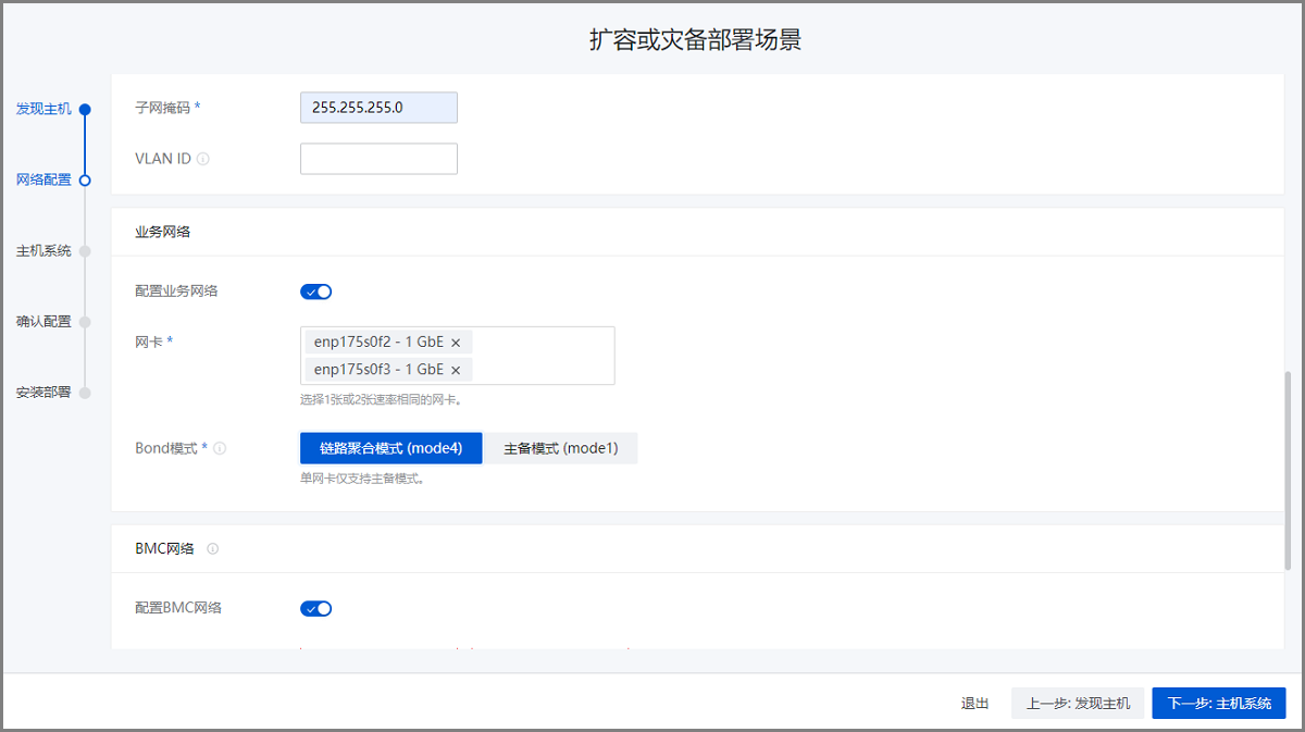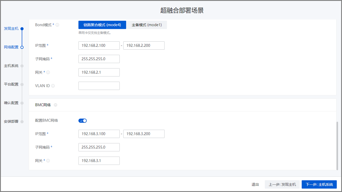 配置网络基础环境,按照实际网络规划对管理网络、存储网络、业务网络、BMC网络进行配置。