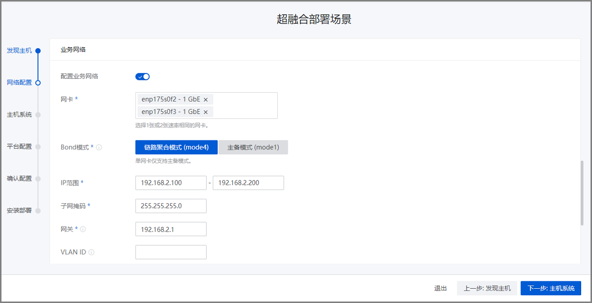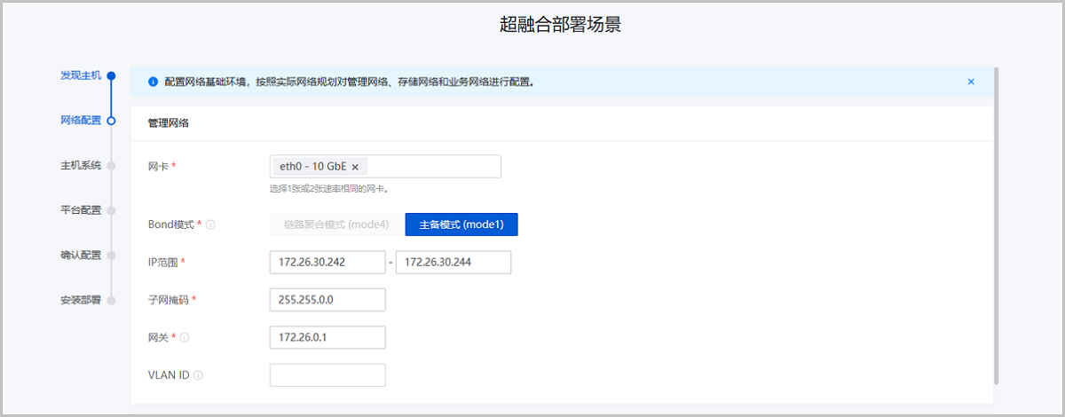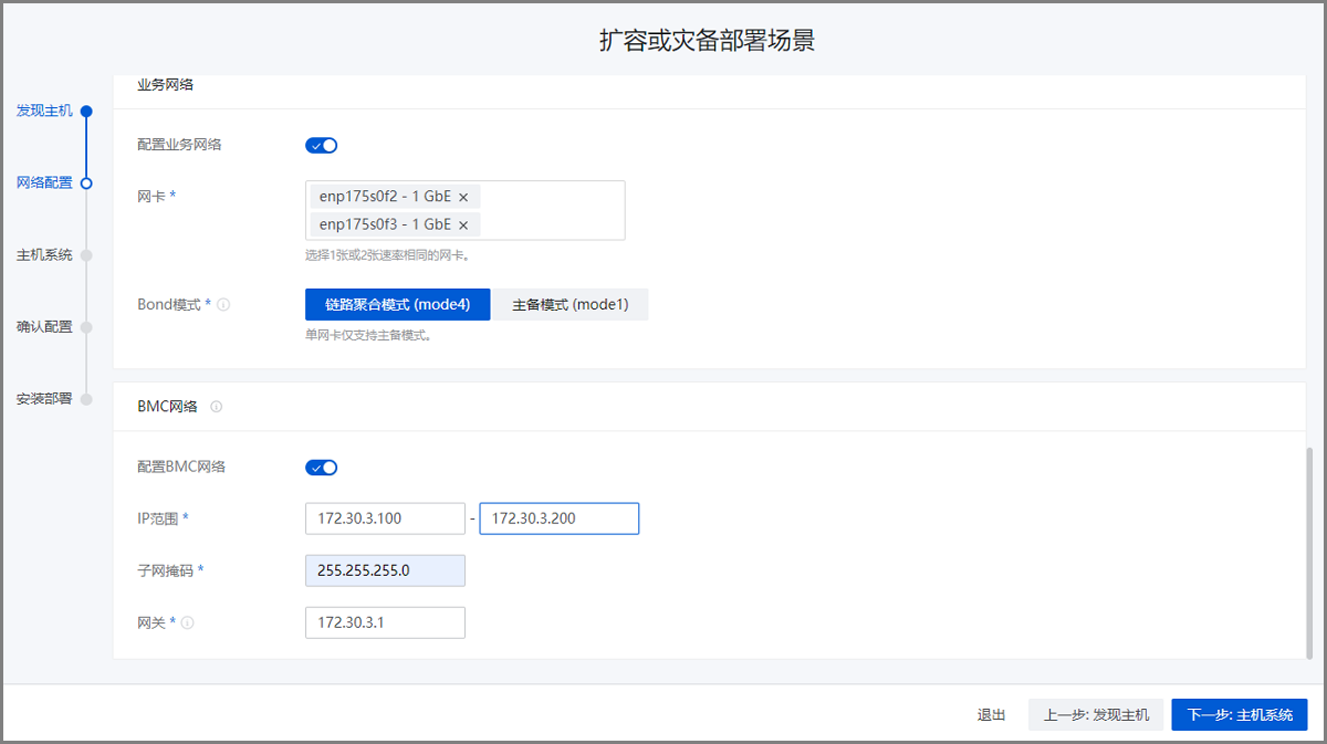 配置网络基础环境,按照实际网络规划对管理网络、存储网络、业务网络和BMC网络进行配置。