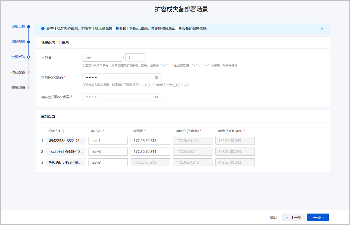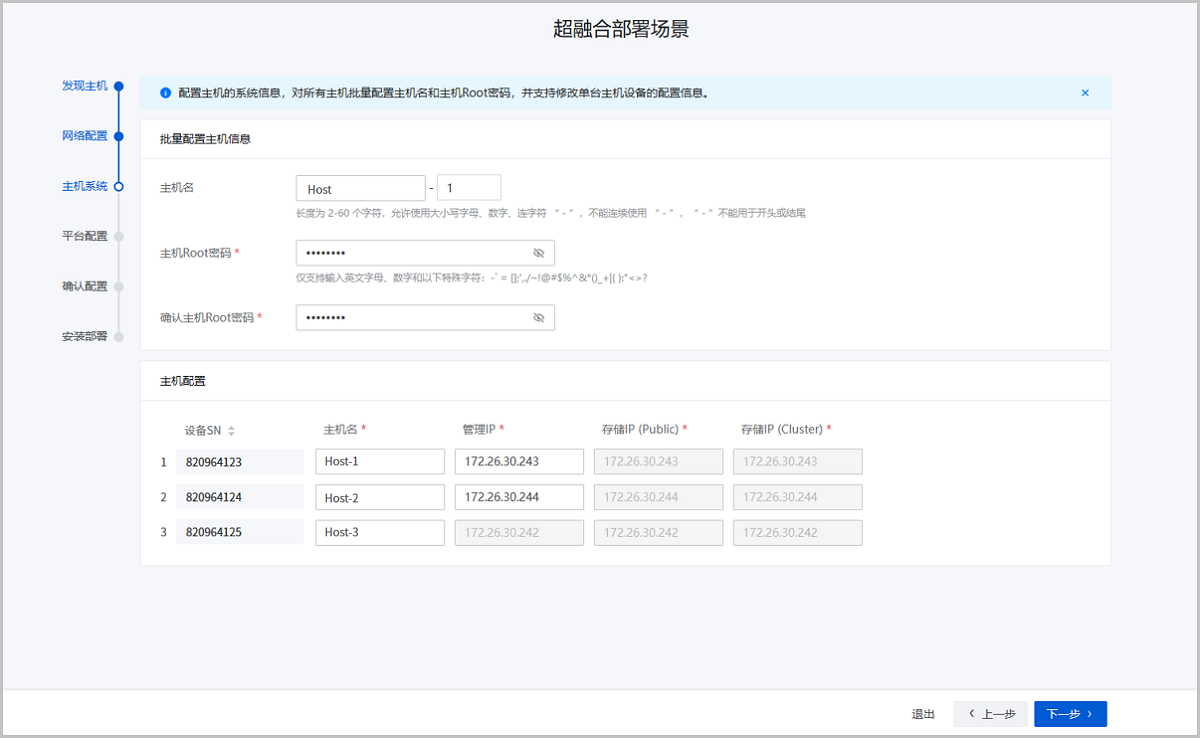 配置主机的系统信息,对所有主机批量配置主机名和主机Root密码,并支持修改单台主机设备的配置信息。