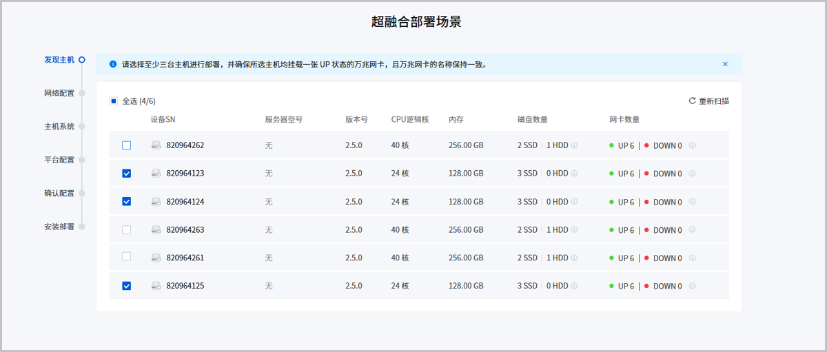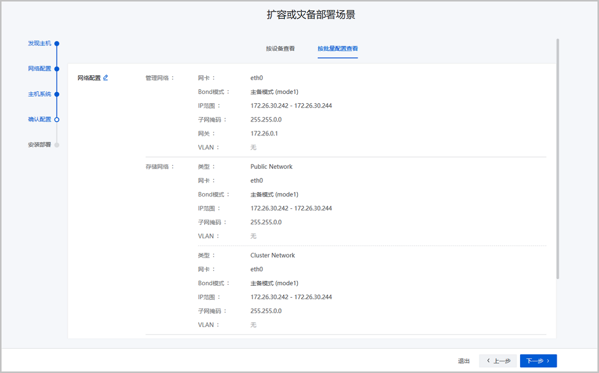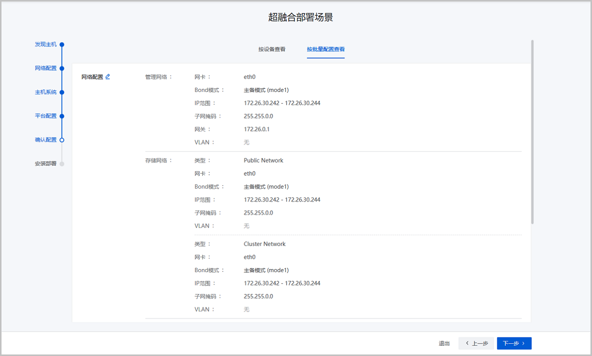 确认配置页面将已完成的全部配置进行展示,用户可以按设备或按批量配置进行查看,确认无误后点击下一步,即可按照配置信息开始安装部署。