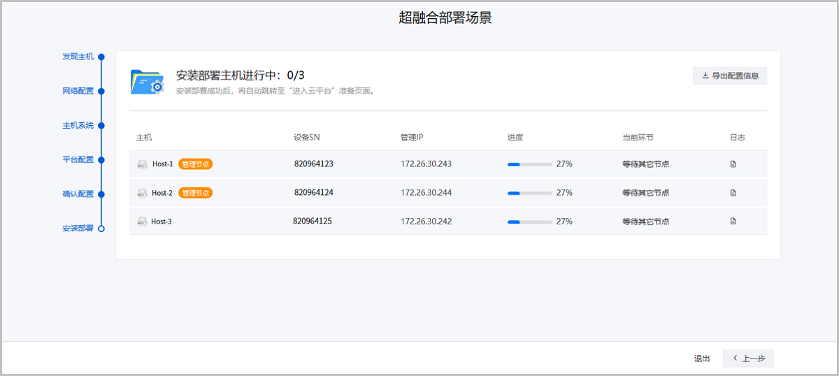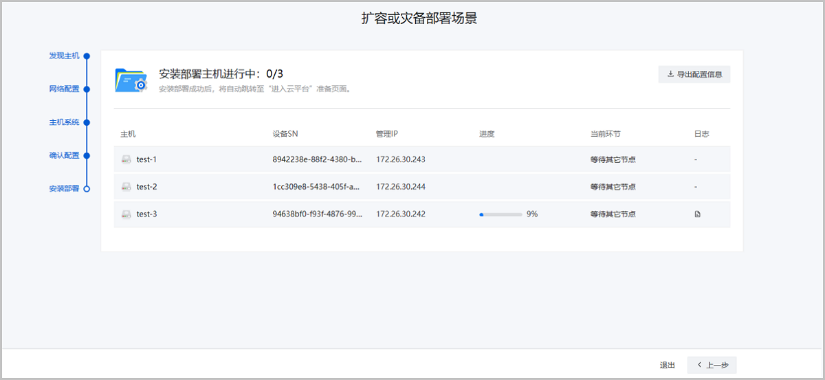 安装部署页面以列表形式实时展示各主机的安装进度,并提供日志查看与配置CSV格式导出功能 ,请耐心等待安装完成。