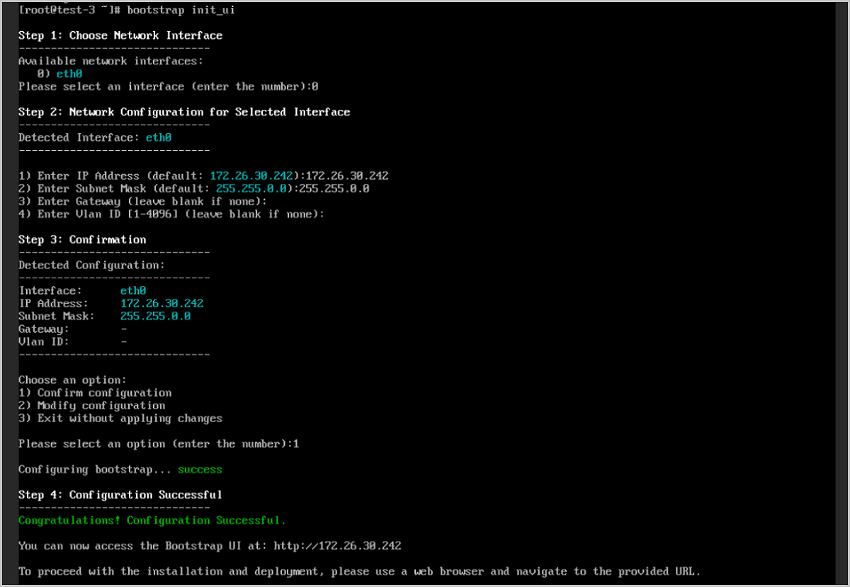 [root@test]# bootstrap init_ui //进入bootstrap_ui配置 # Step1: Choose Network Interface //步骤一:选择网络接口,用于配置bootstrap IP ------------------------------------------------------------------------------------------------------ Please select an interface (enter the number) //选择一个网络接口# Step2: Network Configuration for Selected Interface //步骤二:配置网络接口 ------------------------------------------------------------------------------------------------------ 1) Enter IP Address (default: xxx.xx.xx.xxx) //设置IP地址,推荐使用管理网IP地址 2) Enter Subnet Mask (default: xxx.xxx.x.x) //设置子网掩码 3) Enter Gateway (leave blank if none) //设置网关。如不使用网关,可留空不填 4) Enter VLAN ID [1-4096] (leave blank if none) //设置VLAN ID,需根据网卡所连接交换机配置进行设置。如不使用VLAN,可留空不填# Step3: Confirm //步骤三:信息确认 ------------------------------------------------------------------------------------------------------ Choose an option //选择以下操作 1) Confirm configuration //确认配置 2) Modify configuration //修改配置 3) Exit without applying changes //退出bootstrap init_ui配置,本次配置信息不会被保留
