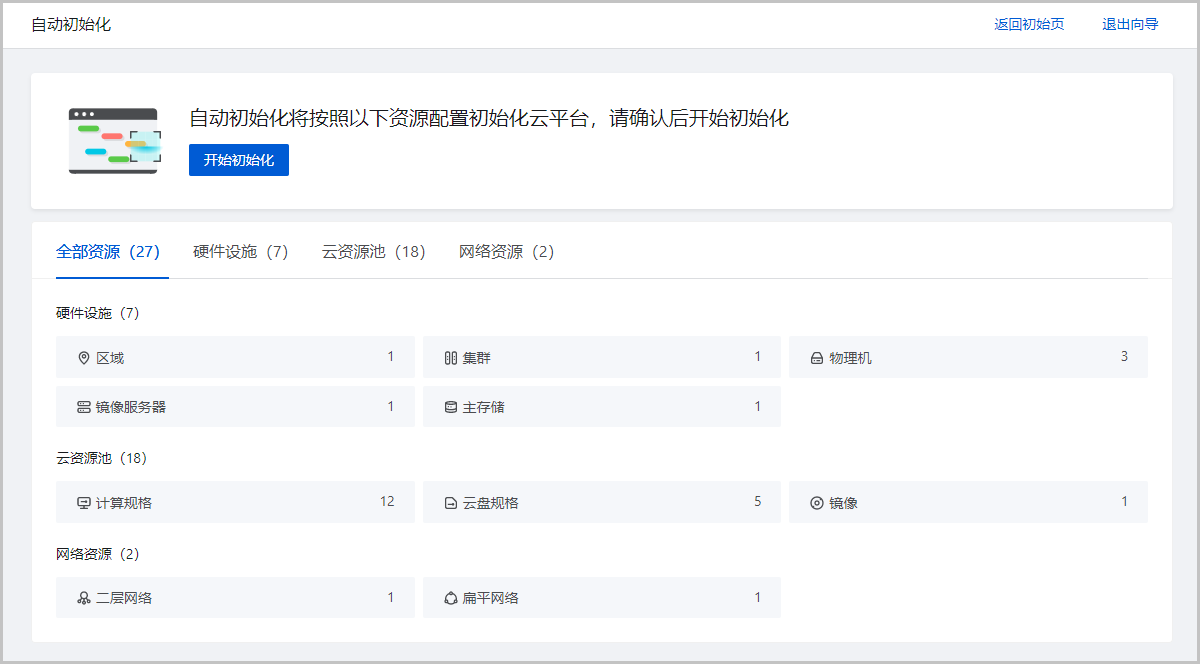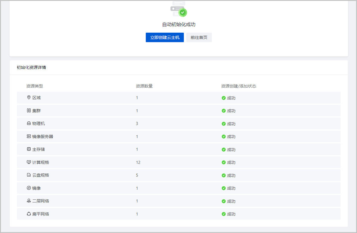 点击开始初始化,将按照以上资源配置初始化云平台。