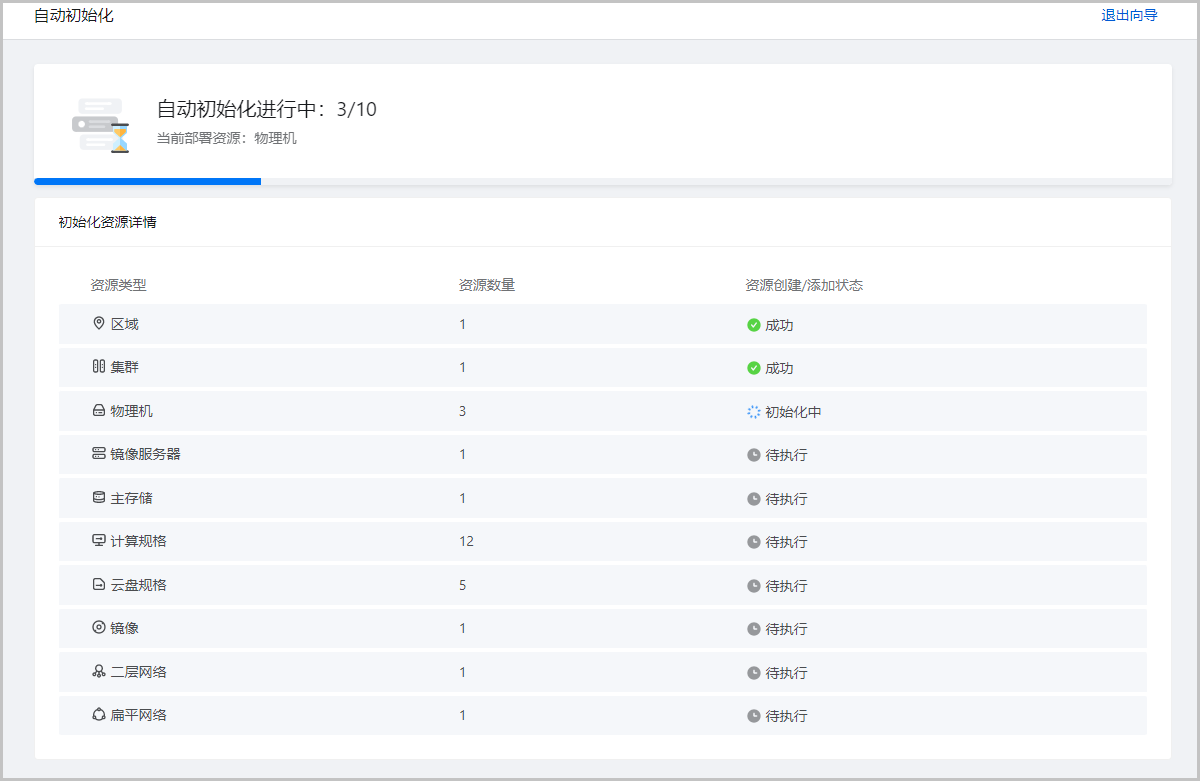 说明: 若存在资源创建/添加失败,点击重试后,将从创建/添加”失败“的资源开始继续初始化。