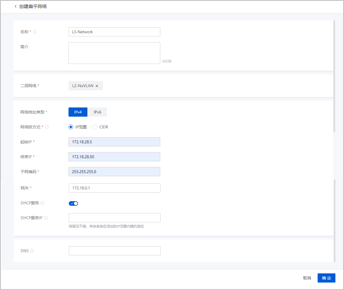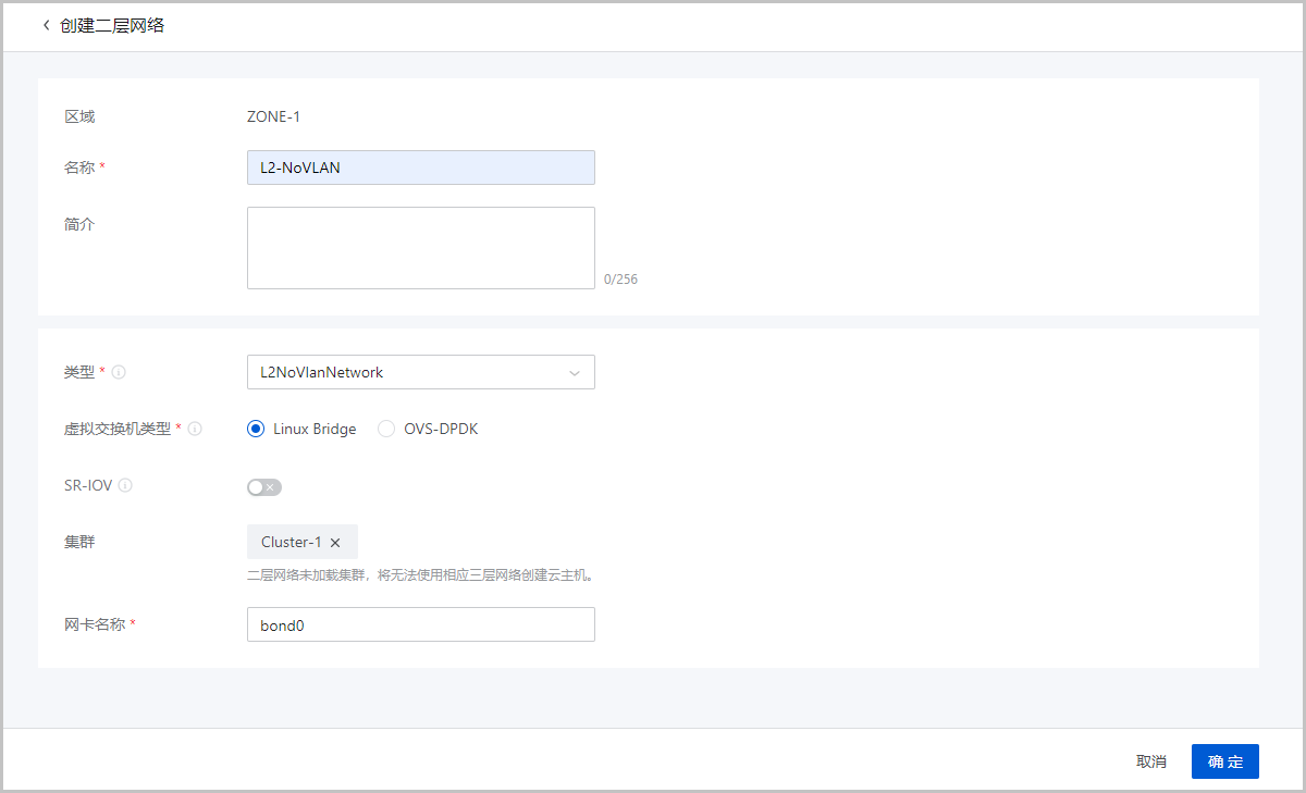 • 类型:可选择以下网络类型:L2NoVlanNetwork、L2VlanNetwork