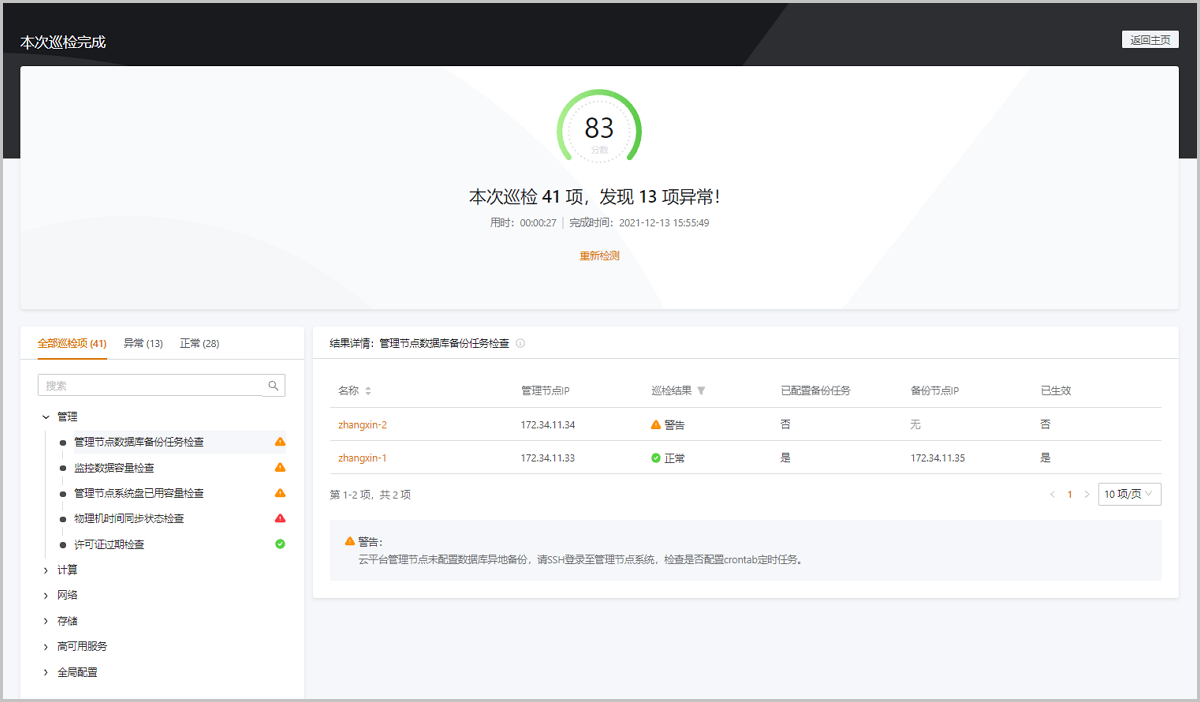 巡检结果页面上半栏汇总统计本次所有巡检项数量以及处于异常状态的巡检项数量,并根据健康评分机制为本次巡检项进行整体统计打分,直观展示巡检项整体健康状态。同时,巡检结果记录本次一键巡检的用时以及完成时间,方便用户安排下次巡检时间。若需了解详细健康评分机制,可参考健康评分。