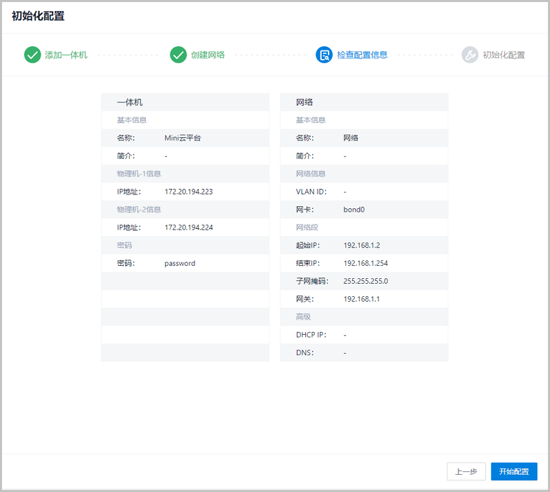 检查无误后点击开始配置,ZStack Mini将自动开始初始化配置。