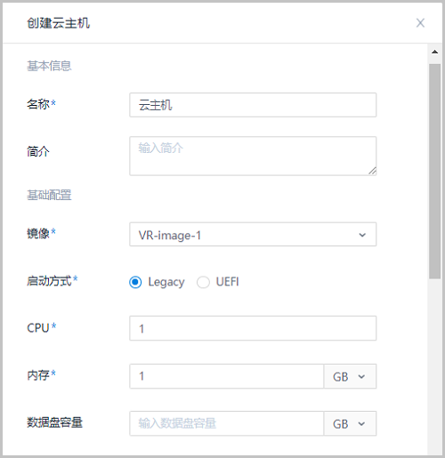 云主机界面,点击创建云主机,弹出创建云主机界面。可参考以下示例输入相应内容: