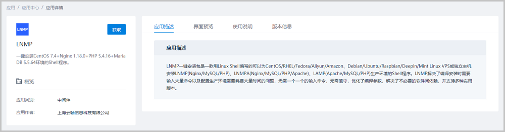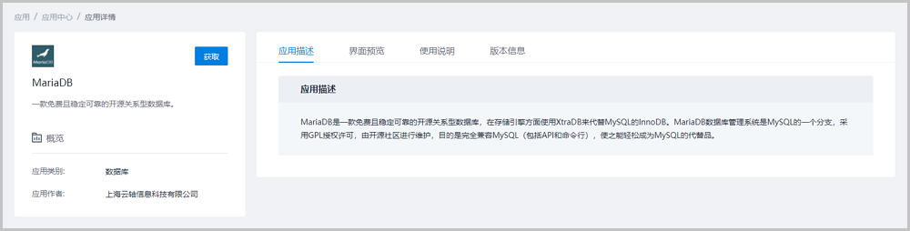 点击获取按钮下载应用镜像至系统,即可安装该应用。安装完成后将在我的应用页面中展示,更多详细信息请参考典型使用流程。