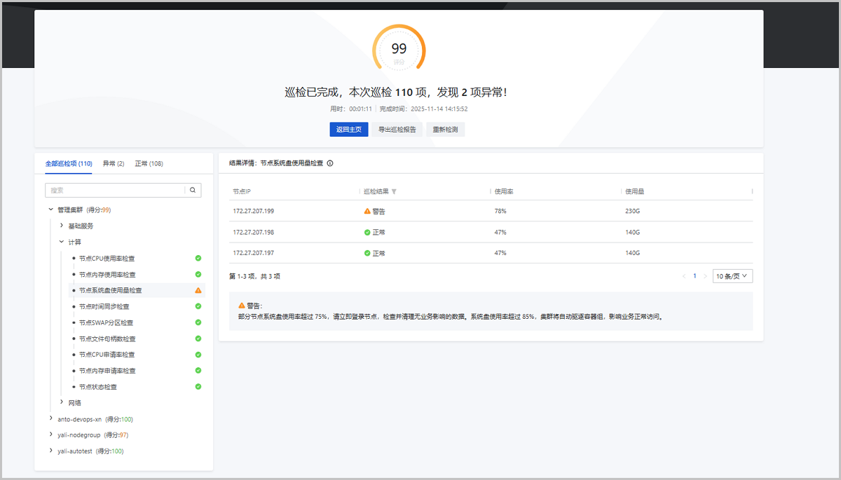 巡检结果页面上半栏汇总统计本次所有巡检项数量以及处于异常状态的巡检项数量,并根据健康评分机制为本次巡检项进行整体统计打分,直观展示巡检项整体健康状态。同时,巡检结果记录本次一键巡检的用时以及完成时间,方便用户安排下次巡检时间。若需了解详细健康评分机制,可参考健康评分。