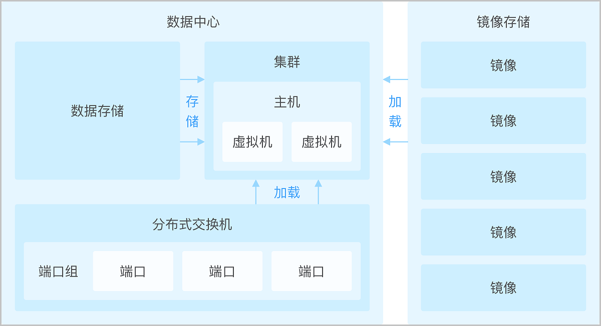 数据中心(Data Center):虚拟化平台内最大的资源命名空间,包括:集群、主机、数据存储、分布式交换机、分布式端口组等资源。