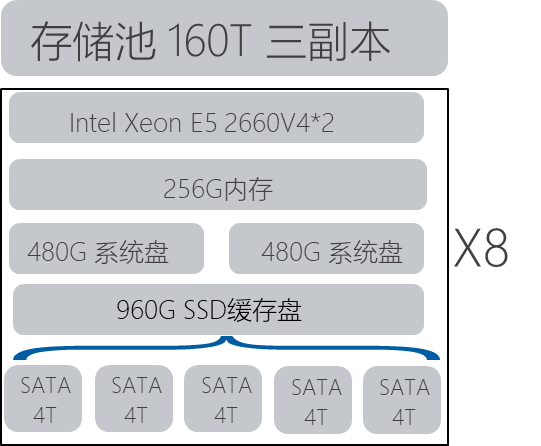 5. 存储规划,8台E5-2660的服务器提供5x4Tx8的存储容量,约160T。后4台服务器提供5X2.4Tx4的存储容量,约48T。